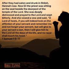 So instead of complaining to Elkanah, or arguing or fighting her rival, Hannah prayed to God. She promised God that she would give her son all the days of his life. v.11 This prayer is not about exchange deal – give God something in exchange for something. Hannah poured out her misery to God. God was her counsellor – she knew God was listening and hearing her grief. Hannah promised to give God back what He would give her in gratitude and worship.