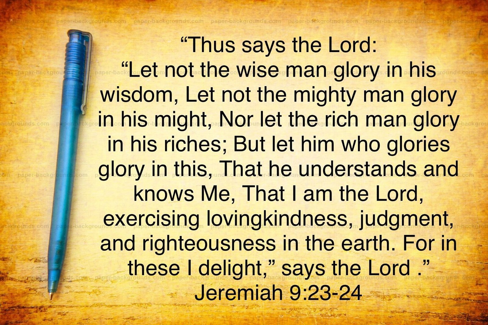 23 Thus says the Lord: “Let not the wise man boast in his wisdom, let not the mighty man boast in his might, let not the rich man boast in his riches, 24 but let him who boasts boast in this, that he understands and knows me, that I am the Lord who practices steadfast love, justice, and righteousness in the earth. For in these things I delight, declares the Lord.”